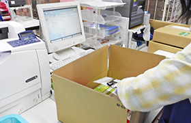 仕分された商品は注文データと手元にある商品が一致しているかをパソコン、もしくはハンディーターミナルを使用して商品のバーコードを読み取って確認し、運送中に商品が壊れないように箱や袋を用いて梱包します。